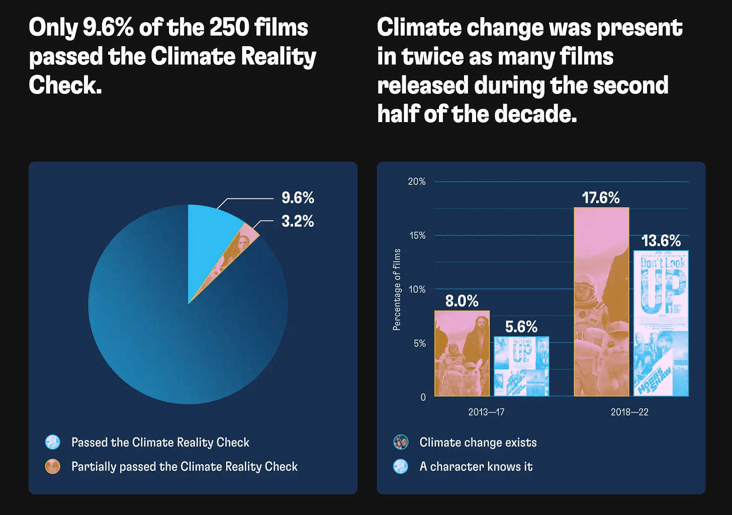 We have a long way to go to reach Good Energy’s hope of seeing 50% of Oscar-nominated films passing the Climate Reality Check by 2027, but hope is not lost. In another of their fascinating analyses, Good Energy looked at 250 films released between 2013-2022 and found that climate representation was on the rise. Although less than 10% of the films passed the Climate Reality Check, climate was present in twice as many films in the second half of the decade examined.