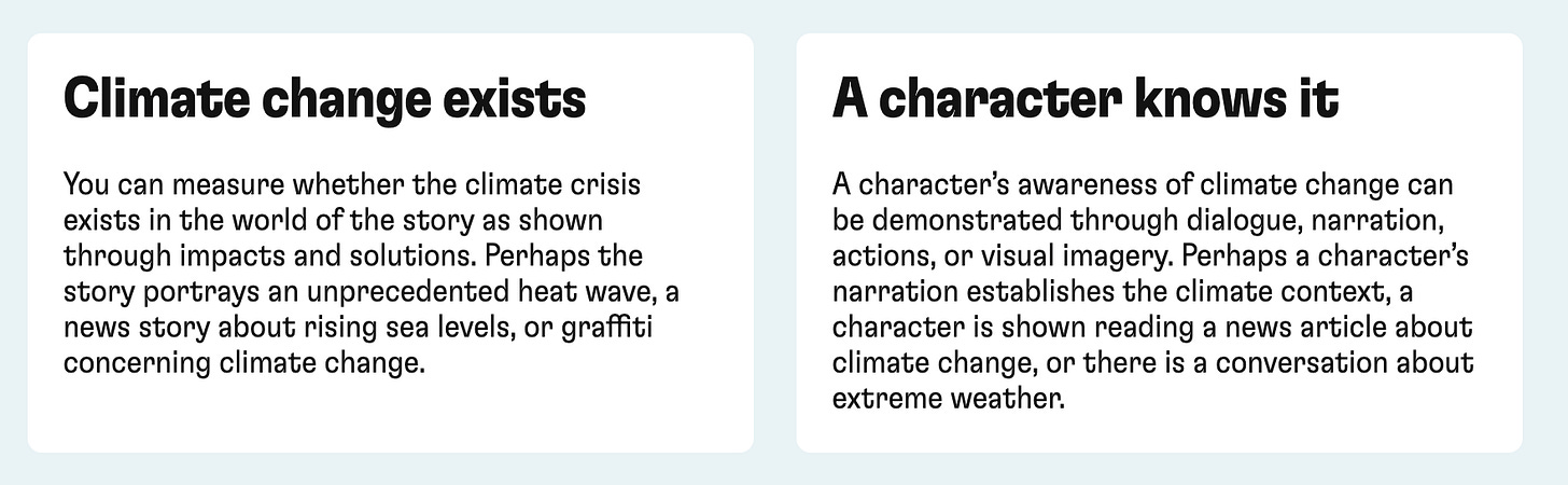 Once those have been narrowed down, the Climate Reality Check tests for two things in each story: does climate change exist? And, does a character know about it? It does not require every film to center climate in its narratives, it just checks whether it’s directly referred to throughout the film. Vague posters that say things like “save the planet” might not be enough to pass, but an unimportant character calling out #ClimateChange might be.